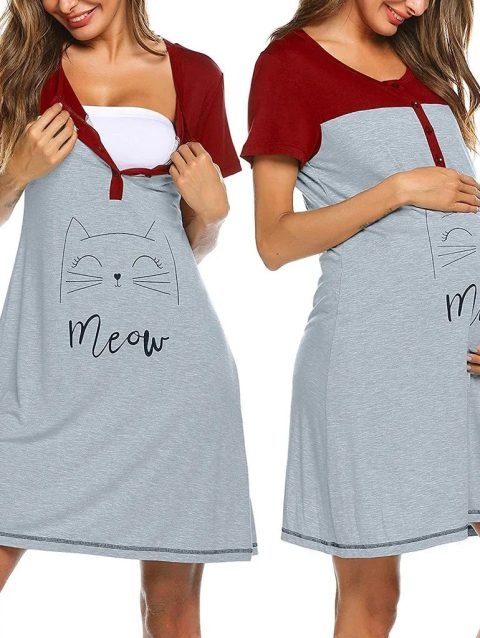 Women Maternity Dresses Short Sleeve Cute Print Pajamas Maternity Short Sleeve Cute Print Nursing Nightdress Breastfeeding Dress