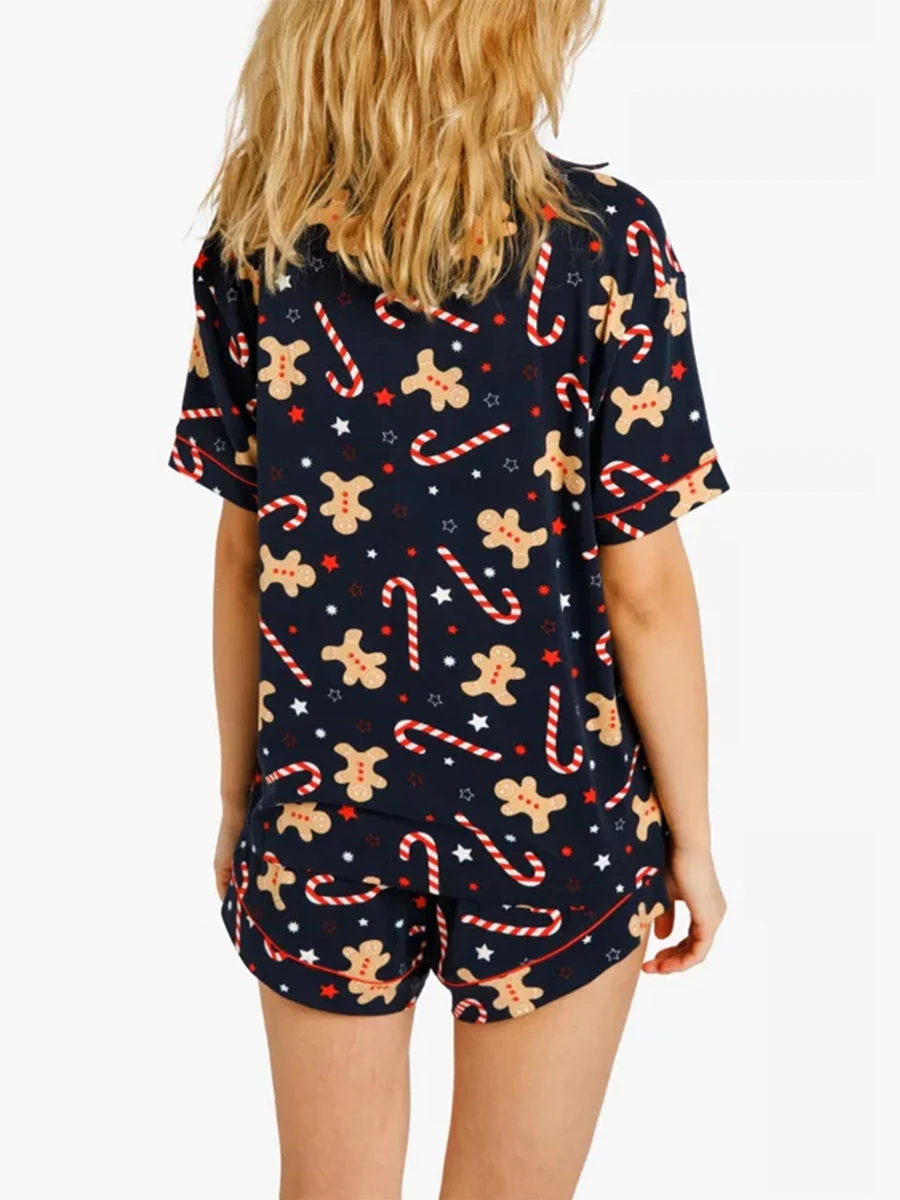 Women Christmas Pajamas Set Gingerbread Man Print Short Sleeve Button Closure Shirt with Shorts Sleepwear Loungewear