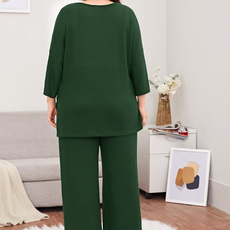 Stay comfortable and stylish with our CasualCurves pajama set. Designed specifically for plus-size women, this set features a solid color pattern in black or dark green, making it perfect for any casual occasion. The 3/4 sleeves add a touch of elegance while still providing a relaxed and comfortable fit.